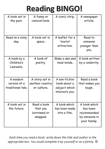 * Why not try our Reading Bingo sheet! You could complete it independently or as a family. Challenge yourself to read as many as possible over the course of this year.